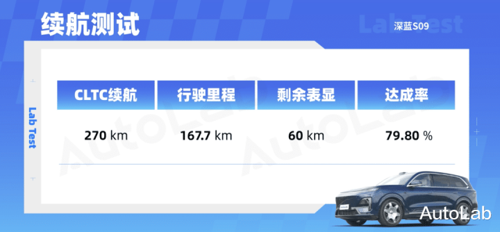 经过我们实测,深蓝S09在电量90%~20%区间内实际行驶里程167.7km,以CLTC纯电续航300km的标准计算,其纯电达成率为79.8%。