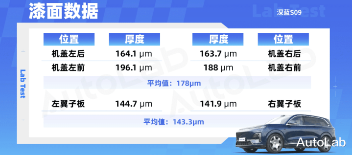 这一点上深蓝S09 的表现基本符合预期,其前引擎盖主平面上下左右,两组对照点的漆面厚度相差不算大,比如其前引擎盖主平面左下和右下漆面厚度分别是164.1um和163.7um,而左右两侧翼子板漆面厚度分别为144.7um、141.9um。