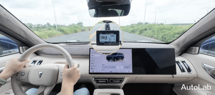 性能测试第一项为零百加速,我们拿到的是深蓝S09 2025款 四驱Ultra+ 超长续航高定版,其前后双电机总功率362kW,总扭矩637N·m,具备官方5.9 S的强悍加速性能。